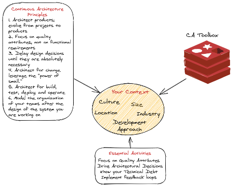 The six principles are complemented by a number of well-known architectural tools such as utility trees, decision logs and design tactics to name a few, as well as by a set of essential activities for architecture – see diagram below.